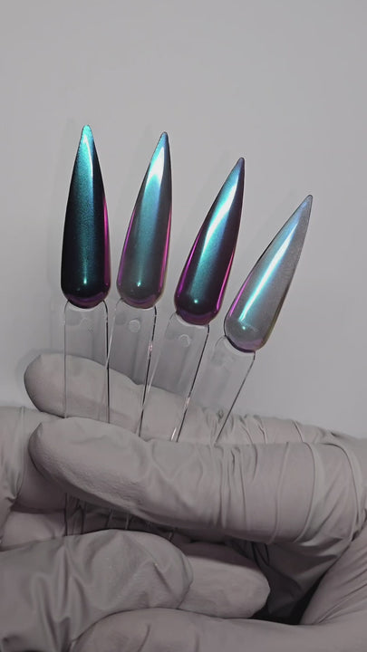 Das Farbmusterfoto zeigt Chrom, aufgetragen auf einer Serious Black Gel-Basis. Das Erscheinungsbild kann je nach Basis variieren. Video-Farbmuster folgen in Kürze.